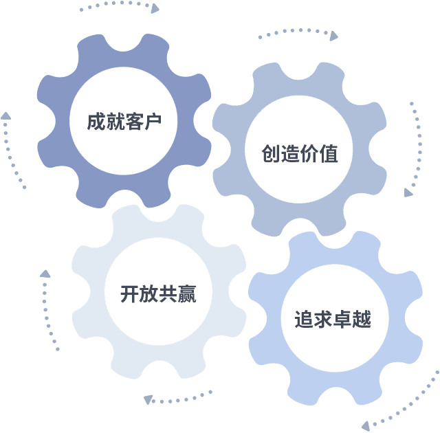 成就客户是一切决策的出发点,,,,创造价值是衡量所有工作的标准,,,追求卓越是我们做事做人的态度,,开放共赢是我们的格局也是最终的结果。。。。价值观的齿轮环环相扣,,,推动着组织里的每个人不断向前。。。